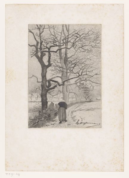 Theodore Roussel made this print, ‘Gezicht op met sneeuw bedekte tuin’ or ‘View of a snow-covered garden’, using etching – a process which relies on careful mark making to bring an image into being. There’s a quietness to this winter scene, a contemplative mood achieved with a monochrome palette. Look at how the dense thicket of bare trees and the snow-laden hedge in the foreground create a textured surface. Roussel coaxes out so many tones from the metal plate through the varying depth and density of his etched lines. It’s a study in contrasts: the light of the snow against the dark of the trees, the sharpness of the branches against the soft, blurred textures of the snow drifts. See the way the fence fades into the background, almost disappearing under the weight of the snow. This print reminds me of Whistler’s etchings of the Thames; both artists shared an interest in capturing atmospheric effects through tonal variation and detailed observation. Ultimately art is about seeing, and it’s up to each of us to bring our own experiences to it.