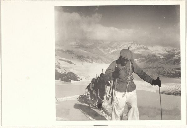 Editor: This black and white photograph, "Climber--Sports" by Robert Frank, likely taken between 1941 and 1945, features a group of figures in a snowy landscape. The mood feels stark and solitary. What cultural weight might these bundled figures carry across time, do you think? Curator: That solitude is key. Notice how the monochrome palette simplifies the scene. Consider the archetypal journey, the climb representing hardship and struggle, both individual and collective. These aren’t casual skiers; their burden is suggested by the steep climb, potentially reflective of wartime anxieties and communal endurance. What visual cues tell you about their implied purpose? Editor: Well, the presence of what appear to be rifles, or some kind of long tool or equipment and what looks like wartime attire... How does that tie into the symbolism of ascent? Curator: Exactly. The rifles and attire shift the climb from leisure to something more… charged. Ascent becomes less about personal achievement and more about duty, survival, perhaps even sacrifice. The group dynamic also creates interesting tensions, highlighting collective experience of overcoming adversity and the ever-present symbol of leadership, but at a great, often unspoken, cost. Editor: So the symbolism becomes tied to a specific historical context, amplifying the sense of shared experience and sacrifice. What did you learn from your analysis? Curator: That photographs, even seemingly simple landscapes, can act as powerful containers for complex cultural memories, and Robert Frank knew just how to tap into it. Editor: Definitely. It's remarkable how much symbolism can be packed into a single, stark image.