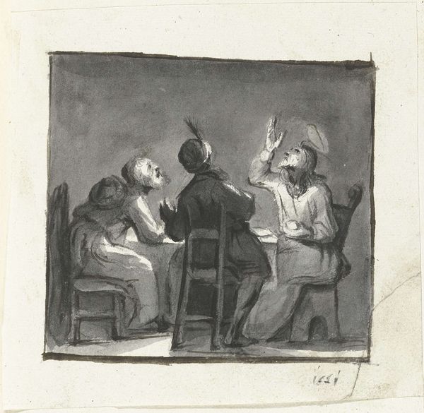 Editor: So, this drawing is "Maaltijd in Emmaüs" or "Meal at Emmaus," possibly from 1594 to 1677, by Gerard ter Borch the Elder. It’s rendered in charcoal, ink, and watercolor on paper and housed here at the Rijksmuseum. The tonal range achieved with the limited color palette is striking. How would you interpret the visual organization of this drawing? Curator: Focusing purely on the intrinsic pictorial structure, observe how ter Borch articulates space. The composition adheres to a precise orthogonal structure, defined by the table and the orthogonals meeting in the background. Consider how the centrally placed figure is haloed. This serves as a focal point. Do you observe how the light reinforces a formal reading? Editor: Yes, the light emanating from the central figure draws your eye immediately. But what does that central figure *represent* to the visuality? Curator: Within a formalist analysis, representation takes a back seat. Note how the contrasting dark shadows against the lighter planes construct a cohesive composition. How the light and shadow themselves operate structurally within the piece, establishing depth, volume, and rhythm for the eye. This self-referential approach transcends a reliance on symbolism. Editor: I see what you mean, though I keep wanting to analyze the iconographic dimension! Are there other drawings with this kind of composition we can compare it to? Curator: Yes, examining works by contemporaries can reveal shared formal concerns and structural motifs. Focus on line, tone, and balance rather than searching for meaning through subject matter. What’s most remarkable is the way ter Borch's handling of the composition serves a dynamic interplay between form and light. Editor: That makes sense, it's about understanding the essence of the artwork through the intrinsic artistic choices made. I definitely see the drawing in a new light. Curator: Precisely. Understanding the visual grammar of an artwork is crucial to appreciation and informs any external interpretive activity.