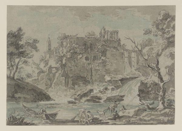 Jean-Antoine Linck rendered "Vue de Clée, pays de Vaud" with pen, brush and gray ink. The composition, dominated by muted tones, evokes a serene yet subtly turbulent atmosphere. A semiotic analysis of the elements reveals a play between nature and civilization. On the left, the old castle, a cultural signifier, contrasts with the rushing waters in the foreground. The bridge, a symbol of connection, spans the gap between wildness and order. Figures on the bank suggest a human presence interacting with the landscape. Linck uses the formal structure to pose questions about mankind's place in the natural order. Does it harmonize or dominate? The subtle gradations of light and shadow, achieved through delicate brushwork, emphasize a certain ambiguity. This ambiguity is not just aesthetic but reflects broader philosophical concerns about the relationship between humans and their environment. Note especially how the careful formal arrangement, invites us to reflect on these enduring questions.