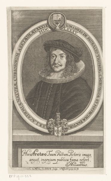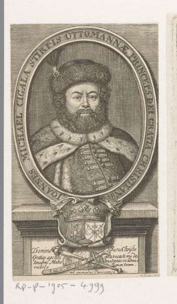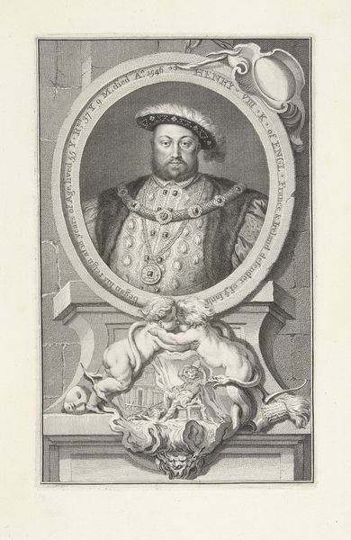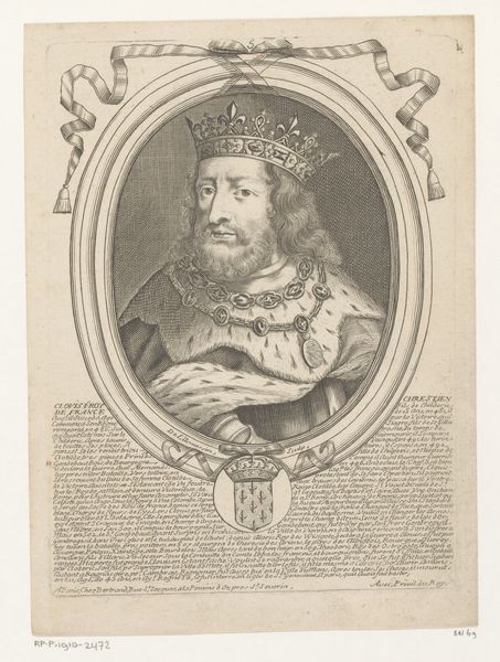 Nicolas de Larmessin the First created this engraving, *Portret van Chilperik I*, sometime in the late 17th century. It’s now held in the Rijksmuseum. The print presents a portrait of Chilperic the First, who was a Frankish king in the 6th century. The visual codes of royalty are clearly on display here. Chilperic is dressed in regal attire complete with a jeweled hat, heavy chain, and fur-lined robes. Below the portrait, a coat-of-arms is framed within an oval border. The portrait is overlaid with text that describes Chilperic’s place in the succession of French Kings. Made in France, this print reflects the French monarchy's attempts to legitimize their rule by evoking the legacy of ancient kings. The print is an exercise in nation-building and is part of a robust visual culture that supported the monarchy. To understand this portrait more fully, we might consult historical records and genealogical resources to explore the relationship between image and power. Understanding this context enriches our understanding of the artwork.