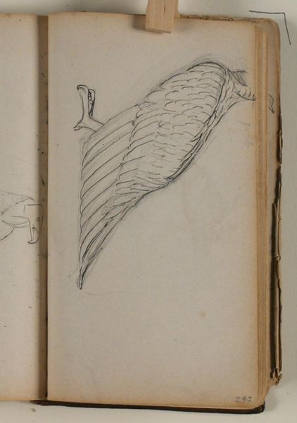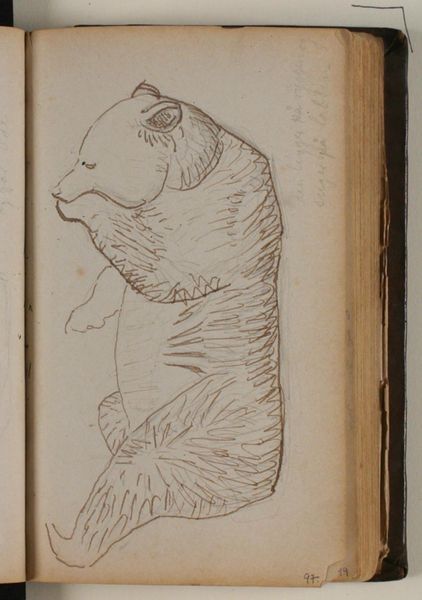 Curator: What a stark piece! It looks like a hurried sketch. Almost as if the artist only had a few minutes to capture the animal's essence. Editor: That's true. What we're looking at is "Studie af liggende isbjørn"—Study of a Lying Polar Bear—penned by Niels Larsen Stevns sometime between 1864 and 1941. It’s graphite on paper. Curator: Given that timeframe, it invites questions about representation of the arctic in art at a crucial time, what was the artist saying about the polar bear's place in our imagination during the late 19th to early 20th century, just as climate change was entering public awareness? The politics are intriguing. Editor: It feels almost hauntingly prophetic. There's a rawness in the line work that captures the bear’s vulnerability, yet there is also this quiet defiance, I sense themes of isolation, especially when viewing it today with our understanding of habitat loss and endangered species. Curator: Precisely. And even beyond the emotional resonance, thinking historically, bear drawings and paintings would have carried connotations of colonial expansion, as well as being seen as rare finds for European viewing—this shifts the art from simple representation to an assertion of authority, wouldn't you say? Editor: It complicates the image, no doubt. Knowing the bear may have been sketched at a zoo or traveling exhibit rather than in its natural habitat gives us an added layer of critical inquiry, as you suggest. Curator: We really are invited to contemplate on this animal, from both the past to our present, right? What do you find most thought-provoking about this piece overall? Editor: Its relevance, both artistically and as a poignant symbol—to have Stevns' intimate view intersect with pressing concerns about environment feels eerily timely. What about you? Curator: I would say the fact that this is not an “finished” painting that was exhibited, rather a glimpse in a private sketchbook, that now becomes available for a wider public as evidence of the role that zoos and public spaces had at that moment for art. It encourages us to think about the role that natural sciences had at that moment, influencing what and how art was made, as well as the political context. Editor: Absolutely! Thanks for shining that light on the image; very incisive, thank you.
