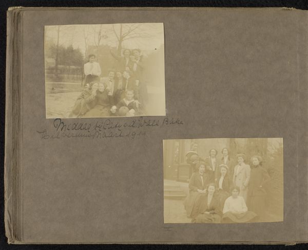 Curator: This is “Twee groepsportretten van Loentje Onnen met Ella en Winny Uhlenbeck,” a photograph taken by Carolina (Loentje) Frederika Onnen in 1911. It’s part of a larger photo album. Editor: It has a solemn quality, a still life almost, despite being portraits of women. And the album context, with the photographs arranged within it—that speaks volumes about material and memory, doesn't it? Curator: Absolutely. Group portraits at the time often carried significant weight—they symbolized social bonds, familial ties, a carefully constructed identity. Placing them carefully in albums adds a layer of emotional archiving, shaping how future generations remember them. The hat’s worn by the women add a uniform quality while the stance and embrace symbolize unity and belonging. Editor: Look at the subtle differences in how the photographs were produced. The contrast is subdued; you can almost feel the texture of the photographic paper. And consider what's included, or rather what’s deliberately cropped out: the album’s dark pages act as an isolating frame, drawing the viewer's attention, but they also expose a method, and how the meaning accrues value with each photograph added and ordered in place. Curator: And that’s important to notice; framing and isolation often evoke different emotional reactions. The isolation enhances that sense of permanence, of freezing a specific moment in time, especially given the conventions of early 20th-century portraiture. But the uniform clothes signify social cues, don’t you agree? Editor: That's true, but it's precisely within the details of production and social customs of clothing we come to recognize the individual contributions. This photo creates something collectively new by uniting them as one—photography and dressmaking—by carefully posing these three women and placing the picture carefully within this dark album. Curator: I see your point. It all speaks to an intricate choreography, how selfhood and community is negotiated and carefully curated in personal spaces. It provides insights to our human need to document existence. Editor: Agreed. In this intimate space, we get to reflect on how those efforts were meticulously planned, as material objects that accumulate into records of family memory and history.