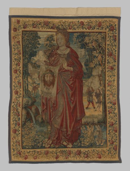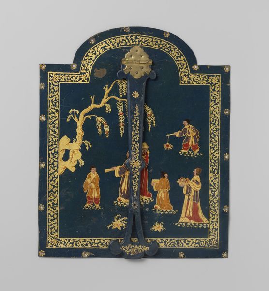 This intricately embroidered cover for ‘The Book of Psalms’, made by the Company of Stationers, presents a fascinating interplay of texture and form. The central image, framed by a circular border, invites us into a pastoral scene rendered in meticulous detail. Note the use of contrasting colours – the blues of the sky and the greens of the landscape – creating depth within the compact space. The figures, stylized and linear, are positioned to draw the eye across the scene, engaging in a narrative that remains subtly ambiguous. The cover’s materiality, with its raised stitching and varied textures, adds another layer of meaning. The tactile quality of the embroidery contrasts with the flat representation of the scene, creating a tension between the object's physicality and its pictorial illusion. This tension challenges the traditional function of a book cover, transforming it into an object of contemplation. How does this elaborate, handcrafted design invite reflection on the spiritual content within?
