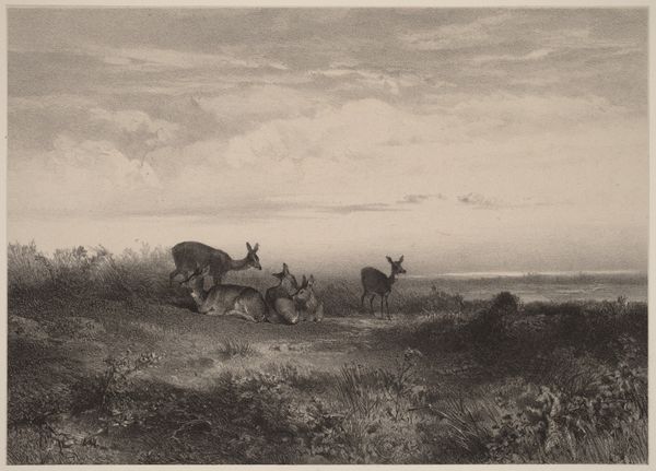 Karl Bodmer created this aquatint and etching, titled “The Morning: Stags and Does,” in the 19th century. Here we see deer in the wilderness, with a stag standing vigil over a herd of does. Bodmer's work highlights the romantic fascination with untamed nature, which found its way into European art and literature. This image offers a visual code reflecting the era's social values; the stag embodies leadership and protection while the does represent tranquility and domesticity. The scene may evoke the vast landscapes of the American West, which were also being 'discovered' and settled during this period. Understanding this artwork also means examining the institutions that shape the production and reception of art. Prints like these, for example, became increasingly popular in the 19th century, making art more accessible to a wider public and also providing a source of income for artists such as Bodmer. By exploring the social, economic, and cultural context, we can uncover the rich layers of meaning embedded in “The Morning: Stags and Does.”