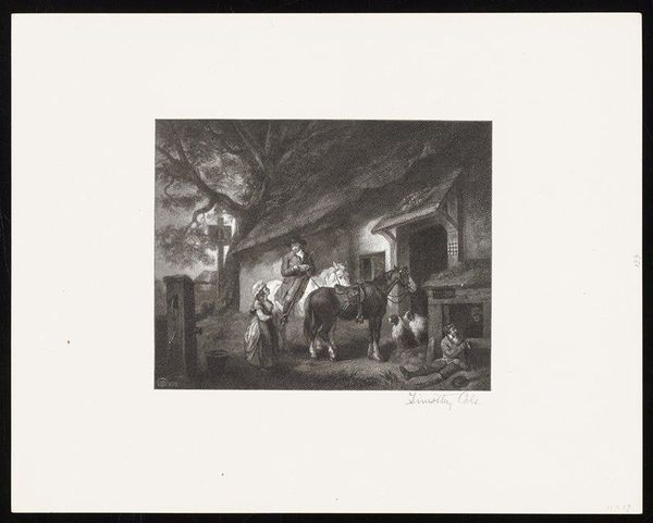 Editor: Timothy Cole's "A Frosty Morning," created in 1901, is a print, likely a woodcut or wood-engraving, now residing at the Minneapolis Institute of Art. I’m struck by the scene's quiet stillness; it’s as if the landscape is holding its breath against the cold. What are your thoughts on how this artwork reflects its time? Curator: Well, seeing this work through a historical lens, I immediately consider the role of industrialization at the turn of the century. Notice the subtle presence of what appears to be a factory or mill in the background. Do you see how its presence, almost ghost-like, contrasts with the rural foreground? Editor: I do now. The factory's smokestack barely pierces through the horizon, so different from the figures traveling by animal-drawn cart. Curator: Exactly! Cole captures the tension between agrarian life and encroaching industrialization. Consider also the audience for such prints. Reproductions like these made art accessible to a burgeoning middle class. What socio-political narrative might that suggest about art consumption at the time? Editor: I hadn’t thought of it that way, but that makes sense. Reproductions democratized art to some extent, making it less exclusive to the wealthy elite. It could imply a shift in who gets to interpret and engage with art. Curator: Precisely. And notice how the artist used grayscale, which heightens a sense of seriousness, connecting this to realism more broadly, giving visibility to subjects that weren't commonly displayed, like those figures by the wagon in "A Frosty Morning." Editor: I hadn't considered those sociopolitical aspects tied to artistic movements! Thanks for opening my eyes. Curator: It’s always rewarding to connect the artwork to the world it came from.