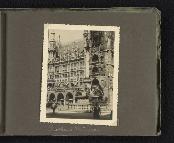 Curator: Cornelis Johannes Dirksen, a Dutch photographer, captured this cityscape, "Stadhuis te Middelburg," sometime between 1860 and 1874. What are your initial thoughts? Editor: My first thought is "craftsmanship." The building itself is ornate, but seeing it in this photographic print, I'm drawn to the labor involved in capturing this image with early photographic technology. It must have required skill and meticulous attention. Curator: Indeed. Consider the town hall's Gothic architecture: the spires, statues, and countless windows. The photograph invites contemplation about civic pride and enduring power, projecting strength through meticulous artistry and repetition of architectural elements. Editor: But that idealized image comes at the expense of human labor, doesn't it? The materials – glass plates, developing chemicals – they all had to be sourced, manufactured, and transported. Photography in its infancy was just as much an industrial process as it was an art. Curator: A fair point, and one that deepens our understanding. Perhaps the light itself becomes symbolic, highlighting not just the facade, but the potential—or even the burden—of progress and industry that went hand in hand with advancements in image making. The clean lines of the windows symbolize societal transparency. Editor: Maybe. Or maybe those "clean lines" required someone to spend hours cleaning glass negatives! I think acknowledging the sweat equity involved pulls us away from simply admiring the romantic symbolism and towards a more grounded reality of Victorian-era life. This image reflects a booming urbanized landscape that's starting to change. Curator: And by acknowledging the material realities alongside the intended symbolism, the image truly becomes a mirror reflecting not just a building, but an era. Editor: Exactly. Looking at it that way makes me appreciate its complexity even more. Curator: It prompts new understandings when the architecture is viewed with a social lens.