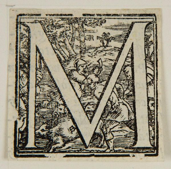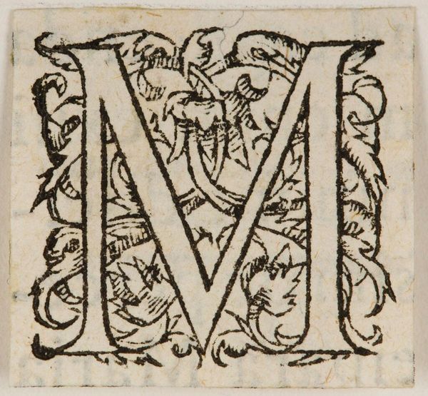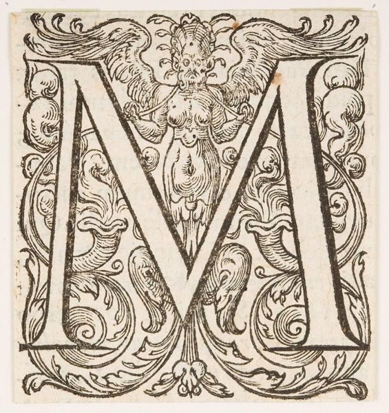 Curator: Here we have "Capital Letter XVI", an anonymous work housed here at the Harvard Art Museums. The initial impression is quite striking; it’s an M, but teeming with life and intricate detail. What do you make of it? Editor: The "M" itself feels almost like a stage, doesn't it? A miniature world packed with symbols of status and possibly of cultural rituals. Curator: Absolutely. Note the instruments—recalling musical traditions—and the figures adorned in what appear to be period garments. It speaks to power, perhaps even a critique of it, given the sometimes grotesque features. Editor: And how might this fit into our contemporary understanding of graphic design and power dynamics? Are these symbols being reinforced or subverted? Curator: That's precisely the tension. It's a dialogue between historical representation and contemporary interpretation. Something about that initial, the gateway it provides to exploring broader narratives. Editor: It leaves us pondering the enduring influence of visual language. Curator: Indeed, a small piece with enormous cultural echoes.