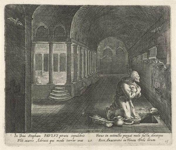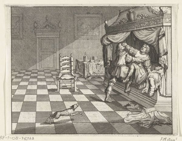 Editor: This print, "The Murder of William of Orange, 1584," by Simon Fokke, was created between 1756 and 1758. The lines are so fine, but the scene is so dramatic! The architecture seems to cage the action. What compositional elements stand out to you? Curator: Note how Fokke meticulously renders the architecture. The receding orthogonals of the vaulted ceiling and the tiled floor establish depth, framing the event with rigid geometric forms. Consider, also, how the explosion functions visually; it acts as a compositional vortex drawing our eyes to the moment of impact but disrupting the linear perspective. Editor: It's interesting that the vanishing point is obscured. The violence seems to almost overwhelm the perspective. The lines are so ordered up until that plume of smoke! Curator: Precisely. And have you considered how the linearity is echoed in the figures? Observe the crisp lines of their garments and the way their postures articulate sharp angles, contributing to the overall sense of controlled chaos. Ask yourself how this formal arrangement contributes to the overall effect of the image. Is it successful? Editor: I think it emphasizes the surprise and suddenness of the event, that structured world interrupted by violence. Looking at the precise lines, it is certainly quite a sight! Thank you for your perspective. Curator: Indeed. Studying the formal elements allows a deeper reading of how Fokke constructs not just an image, but an event, imbued with layers of meaning and feeling.