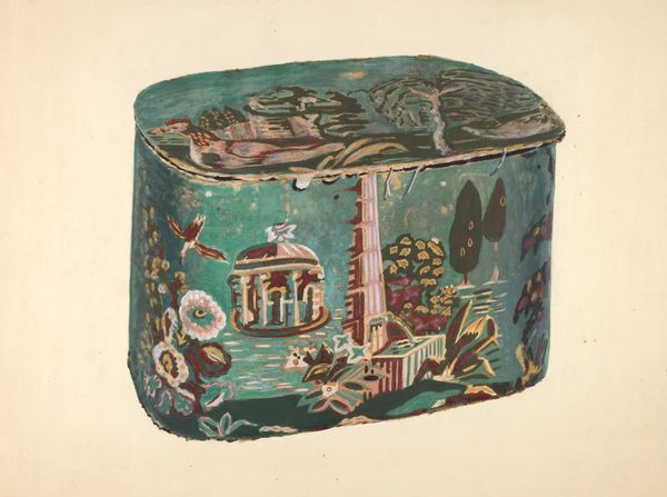 Gilbert Sackerman made this bandbox with a cover, sometime between 1855 and 1995, using paint. Bandboxes, like this one, are usually made from thin wood or cardboard. Then they are covered with decorative paper. Looking at the image, the box is made of cardboard, which offers a lightweight structure perfect for its original purpose: storing collars, caps, and other light articles of dress. But rather than using paper, Sackerman chose to paint the exterior of the box. Painted in a naive style, Sackerman depicted Castle Garden, an entertainment complex located on the tip of Manhattan Island. It operated from the 1820s to the 1940s, and was one of the first large public spaces in New York. The choice of materials, making processes, and imagery are important here. This challenges the traditional distinctions between fine art and craft, inviting us to consider the value and meaning of everyday objects, their decoration, and their connection to social life.