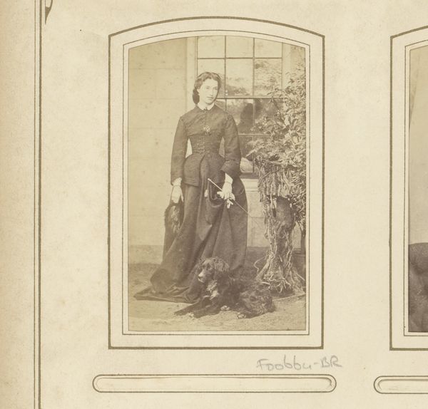 This is C. Perret's "Portret van een vrouw in een witte jurk" a photograph with dimensions of 95 by 51 millimetres. The sepia tone lends the portrait a soft, nostalgic quality. The composition is structured around the contrast between the ornate details of the chair and table, and the woman’s dress. Horizontal lines of the dress create a sense of groundedness and stability, anchoring the figure within the frame. This is juxtaposed with the curving forms of the chair, suggesting movement and fluidity. The lines might also reflect the subject’s position within societal structures. Her posture and placement within this constructed environment speak to the complex interplay between individual identity and cultural expectations. These elements work together to communicate layers of meaning beyond a simple representation.