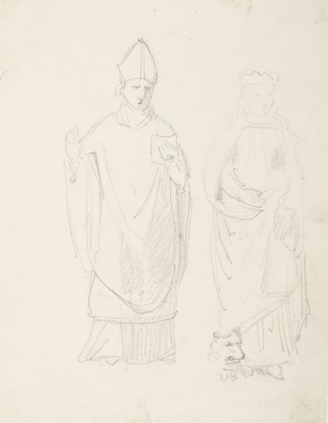 Editor: This is John Flaxman's "Gate of Purgatory." I'm immediately struck by how the stark lines and minimal detail create such a solemn atmosphere. What compositional elements stand out to you? Curator: The linearity is indeed prominent. Notice how Flaxman uses line not to describe volume but rather to delineate form, flattening the figures. Consider, too, how the architecture mirrors the angel’s silhouette. Editor: So, the lines and shapes create a kind of visual echo? Curator: Precisely. And that repetition, that structural echoing, reinforces the symbolic weight of the scene. The formal elements mirror the narrative elements. Editor: I see that now. It's a powerful connection that elevates the simple lines. Curator: Agreed. Studying the image's internal relationships is key to unlocking its meaning. Editor: Thank you! I'll definitely look closer at how the shapes and lines interact from now on.