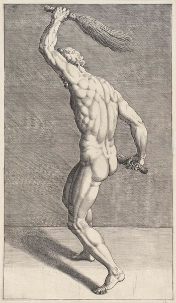 Peter Paul Rubens created this Nude Study using pen and ink, achieving a remarkable sense of depth and texture. The figure's dynamic pose, combined with the stark contrast between light and shadow, immediately draws the viewer in. Rubens masterfully employs hatching and cross-hatching to define the musculature, creating a powerful sense of volume. The lines are not merely descriptive; they build a complex network that articulates the underlying structure of the body. We can see how the artist's mark-making conveys the tension and strain within the figure. The dramatic lighting casts a deep shadow, enhancing the three-dimensionality and sculptural quality. Notice how Rubens uses line and shadow to convey not just the physical form but also a sense of dynamic energy. This study challenges us to consider how an artist can explore the interplay of form, light, and movement through simple means.