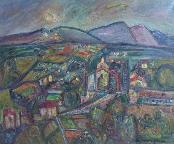 Editor: This is “Unser Haus,” painted by Ernst Ludwig Kirchner between 1918 and 1922, made with oil paint. The vivid colors create such a lively feeling, yet there’s also a sense of isolation in the placement of the house. How do you interpret this work? Curator: The "lively feeling" that you sensed contrasts with the historical period after World War I. Consider Kirchner’s service and subsequent mental health struggles; what looks "lively" to us might be interpreted as jarring and unstable to him. This piece wasn’t just a depiction of a house, but a symbol, perhaps, of his search for stability in the face of widespread trauma and shifting cultural values. Editor: I see what you mean. So, the jarring colours, the somewhat clumsy shapes… It's not naive, but expressive of trauma. Can we consider how Expressionism played a role? Curator: Exactly! Think about how Expressionism allowed artists to depict interior states rather than external reality. What might the colours—the almost aggressively bright blues and pinks—tell us about Kirchner’s emotional landscape at this time? Are they hopeful, manic, or perhaps even masking something darker? Editor: It's like he’s desperately clinging to some sense of vibrancy, maybe fighting off the darkness you mentioned? Curator: Precisely. Furthermore, note the prominent role of "nature" in his landscapes. For Kirchner and his peers, a turn to nature also signals their cultural dissent to city life, to pre-war Germany. What kind of audience was this painting meant to affect? What response would it evoke from this audience? Editor: It’s interesting to think about how it reflected not just personal turmoil but a broader cultural anxiety of the time. The idea of this vibrancy fighting some kind of cultural "darkness"… I never considered art reflecting anxiety. Curator: And art reflects, distorts, and challenges society’s foundations. Considering "Unser Haus" through the lenses of social history and psychological experience gives us a richer, more complex understanding, wouldn’t you agree? Editor: I definitely do. It adds so much depth to what I initially saw as just a colorful house in a landscape.