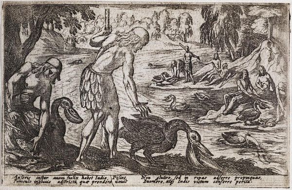 Editor: This is Antonio Tempesta's "November: Bird Hunt and Felling Trees," made around 1600. It's an etching, and I'm struck by how much detail he packs into a single scene. What compositional elements stand out to you? Curator: The spatial organization intrigues. Note how Tempesta employs a complex layering of forms, creating a sense of depth despite the monochromatic palette. Observe the placement of the trees, how they both divide and unite the various activities depicted. Does this layering suggest a hierarchy of actions or merely a simultaneous unfolding of daily life? Editor: I hadn't considered that interplay between dividing and uniting. It makes the scene feel less chaotic. What do you make of the figures themselves? Curator: They serve as integral components of the overall design. Their poses, gestures, and arrangements contribute to the intricate network of lines and shapes that define the work. Consider how their actions—hunting, felling trees, tending livestock—are interwoven with the natural environment. Editor: It's fascinating how the shapes and lines guide your eye through the image. I see it differently now.