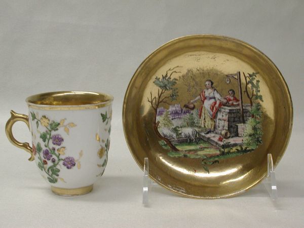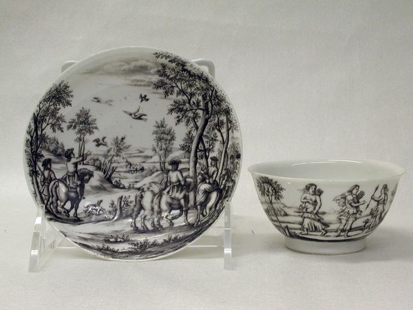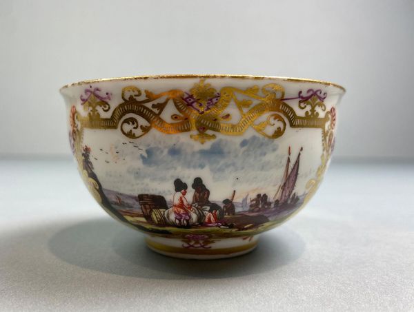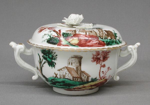 Editor: This lovely "Cup and Saucer" was created between 1745 and 1765 by the Meissen Manufactory. It's porcelain, with watercolor and painting, a piece of decorative art with a miniature landscape. I'm struck by how this object meant for everyday use becomes a canvas. What social dynamics were in play during the Rococo period that might give context to this combination? Curator: That's a great question! We must consider how the elite used decorative objects to project power and wealth. Rococo wasn't just about frilly aesthetics; it mirrored a rigid social hierarchy. This cup, for instance, suggests leisure and luxury, hinting at the exploitative labor practices of the time, including colonialism which funded the raw materials and technologies required to produce porcelain. Who enjoyed these landscapes and at whose expense? Editor: So, this idyllic landscape on the cup… it’s almost a façade? A pretty picture masking a more complex, potentially darker reality? Curator: Precisely. It’s crucial to consider the politics of representation. Landscapes aren't neutral. They reflect specific ideologies. How does this curated, miniaturized view of nature reinforce class distinctions and gendered roles of the period? For instance, the lack of industry or labor in the landscape keeps certain people out of the visual and conceptual field. Editor: That’s fascinating! I never thought about it that way. I always focused on the beauty, but now I see how important it is to look beyond the surface and understand the context. Curator: Indeed! Art provides a powerful lens through which we can examine not just aesthetic preferences, but also power structures, gender inequality, and the historical echoes that reverberate even in something as seemingly delicate as a porcelain cup. Looking at it this way opens new avenues for critical engagement. Editor: Absolutely. Now, when I look at it, I see a tiny world of privilege. Curator: Exactly.