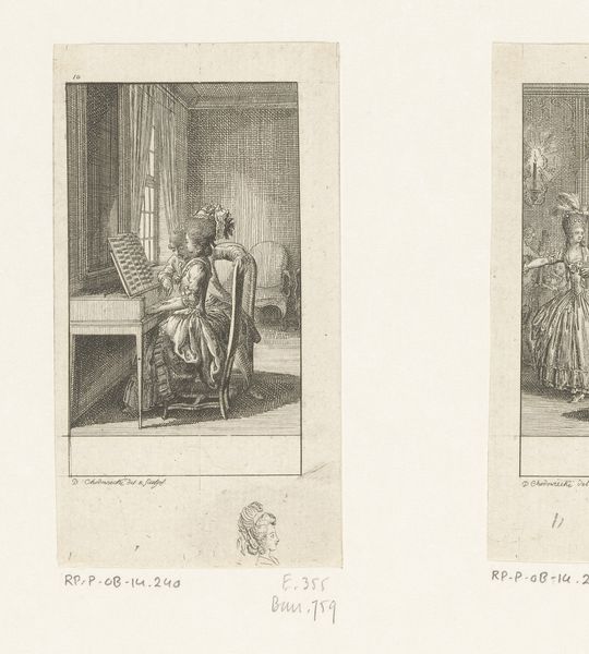 Editor: This is "Gil Blas Embraces Estella" from 1779, by Daniel Nikolaus Chodowiecki. It's an etching, and the composition with its dual scenes feels quite theatrical, almost like stills from a play. What historical contexts are relevant here? Curator: The choice of subject is deeply rooted in the literary tastes of the late 18th century. "Gil Blas" was an extremely popular picaresque novel. Chodowiecki, like many artists, drew inspiration from its social commentary. This print, as a readily reproducible image, amplified the novel's reach, turning social satire into widely consumed visual culture. Who was being depicted and how mattered significantly. Why do you think Chodowiecki chose these particular scenes? Editor: I guess it emphasizes social mobility, and maybe critiques class structures in pre-revolutionary Europe? One scene has an intimate embrace; the other has someone meeting with a bishop? Curator: Exactly. Chodowiecki highlights intimate, emotional moments alongside instances of social maneuvering. He lays bare the relationship between private desire and public performance. How might the viewers interpret it, engaging with power structures? Consider how they viewed social climbing within the Church. Did they critique such actions, and were those ideas accepted? Editor: So the artwork serves almost like a visual editorial, sparking social dialogue about the elite? Curator: Precisely! It implicates the viewer, prompting them to consider their own position within the very societal structures it depicts. The popularity of prints like this helped fuel critical discourse. Considering the socio-political climate, especially the Enlightenment ideals circulating, it questions institutional authority. Is that how you now view the narrative? Editor: I see it very differently now. The print isn't just a pretty scene, it's actually making an argument about power. It also provides commentary about class relations through imagery for wide audiences to absorb, understand, and apply to society! Curator: That's it. Understanding the cultural backdrop illuminates how art can participate in shaping public consciousness.