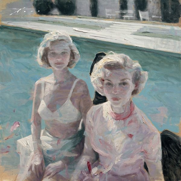 Curator: Well, this strikes me as a fascinating moment suspended in time, Edwin Georgi's piece titled "Rember's Paint." I see…youthful hesitation, maybe? Editor: Hesitation, yes, but also, I'd say, studied idyll. There's something about the pose that suggests not just relaxation, but a performance of it. Like an ad, an advertisement. I bet they want to go swimming... the male looks at her longingly. Curator: A performance, interesting. The image reads differently now that you mention it, like some sort of ritual of early courtship set amidst post-war prosperity? The bright colors definitely resonate with that sort of period, like a commercial break between reels at the cinema! Editor: Absolutely! The social construction of leisure and romance at work. Consider the pose -- she is carefully angled, displaying just enough but withholding a great deal more; she has bare feet, showing she might take her fill, as the man seems so intent she should. Curator: Those tartan shorts speak volumes! It could even be that these are specifically placed there... but also they are clearly in a position of power and the gentleman has no hope other than the gaze, she could dunk her toes forever and he is forced to simply look and like a 'nice boy' wait, with no indication that he should wait! There is an ambiguity with the bare feet too, almost suggesting this painting's subjects exist as more symbolic components of a wider cultural narrative regarding ideal past-times... something is troubling and unsettling at this painting, despite the attractive subjects! Editor: The cultural memory here is potent, with pre-coded gestures and implied dramas which is quite powerful... this work speaks a clear visual language that hints toward broader conversations around gender roles of the mid twentieth century in particular; like how in the world did it get accepted at the museum?!?! A really remarkable study! Curator: I agree entirely! Editor: It really causes us to rethink so many common perceptions around art and imagery! I never could have imagined the hidden levels in "Rember's Paint"... It has left me questioning my reading of similar images in this genre forever, so thank you to us all for going this far together.