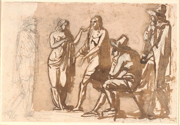"Jesu Dåb" is a sepia drawing by Sigismondo Caula, created sometime between 1637 and 1724. Caula’s work is informed by the Baroque period in Italy, a time marked by religious reform and renewed spiritual intensity. Here, John the Baptist performs a baptism, a ritual of purification and spiritual rebirth. We see figures, rendered with remarkable sensitivity, positioned along a horizontal plane. Caula’s artistic language elevates emotion, and the viewer is invited to contemplate the human form within the context of faith and divine encounter. Consider the implications of baptism, a moment of transformation. What does it mean to leave behind the old self and embrace a new identity? In Caula's time, as now, such a profound change is both personal and political, a redefinition of one's place in the world.
