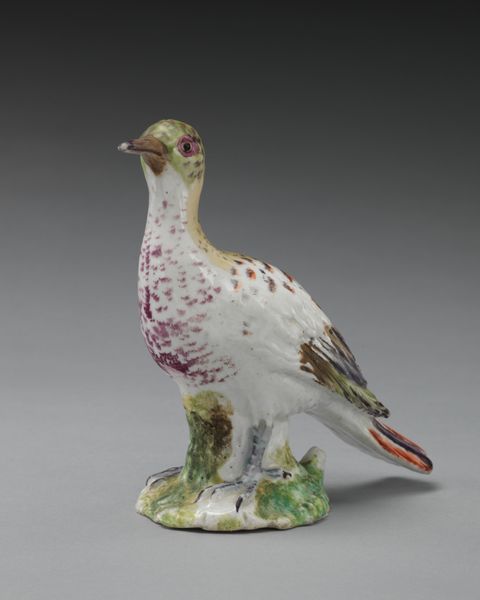 Editor: This porcelain sculpture, “Eagle (one of a pair)” was made by the Meissen Manufactory between 1725 and 1735. Its bright whiteness gives it a surprisingly contemporary feel, almost like something you'd see in a modern design store. How do you see it, looking at it now? Curator: I'm immediately struck by the interplay between form and material. The cold, hard porcelain is expertly molded to depict the soft, feathered texture of the eagle. Notice the meticulous detailing of each individual plume; how does this level of ornamentation affect the viewer’s perception, in your opinion? Editor: I suppose it does draw your eye in; you can’t help but notice the minute textures. It seems to make the sculpture more 'real', in a way. Curator: Precisely. This tension between the real and the represented is key. Consider the color palette, too. The stark white, broken only by a touch of ochre around the face and beak, amplifies the three-dimensional form. Does the colour palette also guide your eye in certain ways? Editor: Yes, the limited color really highlights the subtle changes in light and shadow, emphasizing its form. But beyond its appearance, what significance did these kinds of pieces hold? Curator: Forget any possible allegorical intention. Look, rather, at the line, volume and depth in relation to the coldness and hardness of the porcelain and reflect on how the sculpture's physicality generates emotional and intellectual responses in you, as a viewer. This work exists as a purely aesthetic object, divorced from external meaning and existing only through its physical and material attributes. It generates meaning from the interaction between those and its viewing public. Editor: That’s interesting! I’d not considered thinking about a piece this old in that way before, to leave behind allegorical interpretations and instead simply focus on the artwork’s ability to prompt feelings in people. Curator: Precisely. We mustn't be led astray by cultural context. Let us appreciate the visual experience first.