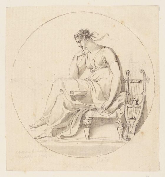 Editor: We're looking at Angelica Kauffmann's "Juno and the Peacock", an etching from 1770. It's quite small and delicate. There’s something melancholic about the figure, her gaze seems so distant. What do you see in this piece? Curator: Melancholic, yes, beautifully put. I see Juno caught in a quiet moment, doesn’t she seem like she's almost sighing? Forget the queen of the gods—I think it’s the subtle drama Kauffmann manages to express with such delicate lines, the shading on her face. Look at how Kauffmann has rendered her clothing—you feel the weight and drape of it. What do you make of the peacock, almost obscured? Editor: It's as if the peacock is a decorative element instead of a majestic symbol, right? I didn't even really *notice* the peacock at first. Curator: Exactly! Perhaps that's the point. Juno's traditional symbols almost fade into the background of her introspection. Maybe Kauffmann is musing on the burden of power, even divine power, stripping the narrative and elevating emotional introspection. Don't you think she seems to be in thought. Does she embrace her regality? Is she bored? Editor: That's really interesting. I was so focused on the sadness I didn’t think about the possibility of the figure considering her role, that burden. Curator: Art is sneaky like that. And Kauffmann was quite canny. Imagine her, in a world dominated by male artists, embedding such complex, quiet reflections on power in a neoclassical frame. What do you take away from seeing it now? Editor: I appreciate the piece much more. It’s more than just a pretty drawing; it’s got a point of view about how roles shape the people playing them. Curator: I'll remember to look closer at her clothes. Thanks!