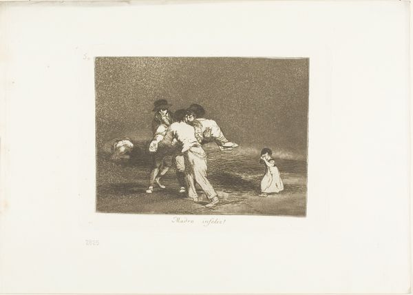 This etching by Francisco Goya captures a visceral moment in the bullring. We witness the raw power of man against beast. The central figure, a bullfighter, grapples directly with the bull, a dance of strength and vulnerability that is as old as the hills. Consider the image of the Minotaur, half-man, half-bull, a hybrid that embodies the primal urges and conflicts within us. Here, in Goya's rendering, the bull and the man mirror each other. The dark shading suggests that each is a reflection of the other, bound together in a deadly pas de deux. The distant spectators, are they watching a sport, or a sacrifice? This struggle is not just physical. It evokes the underlying tensions between civilization and nature, reason and instinct, life and death. As such, the image resonates far beyond the bullring. It is a timeless symbol, a violent clash that repeats itself across cultures and generations.