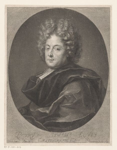 Curator: This is an engraving, simply titled *Portrait of Godfrey*. It resides here at the Art Institute of Chicago. Editor: The somber tonality makes this work feel quite formal. Notice how the figure, set against a dark backdrop, fills the frame—the linear details create a sense of depth within its modest scale. Curator: Yes, and consider the process here: engraving is, at its core, a reproductive medium. Think about the labor involved in meticulously carving those lines into the plate. Each one is a deliberate mark, contributing to the final image. Editor: Precisely. The meticulous details of the engraver capture not only likeness but also suggest a complex play of light and shadow. Note the treatment of the subject’s robe and hair, described only through precise arrangements of lines and tonality. Curator: But to what end? The subject is depicted wearing simple robes—suggestive of an almost casual elegance, but the inscription speaks of a royal messenger, sent by Charles II to Louis XIV. There is some form of status-assertation at play. Editor: I find the absence of overt royal symbols or adornments remarkable. Instead, the emphasis rests upon capturing a specific individual and representing his rank—suggesting an understated display of power. The choice of the print as the production of the artwork also means wider circulation and potentially more social and political significance as the imagery has farther reach. Curator: Indeed. In a time when portraits of leaders frequently used excessive symbols to highlight royalty, here there's an understanding of image economy. We sense an important moment captured by strategic applications of this craft's approach. Editor: The way simple means have been turned towards effective ends for their day fascinates. Curator: Absolutely, and it compels one to question not just what it represents, but how its design and means were meant to shape the status and message within England at the time.