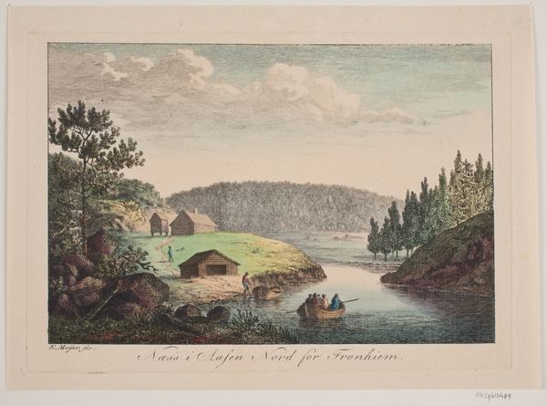 John Hill’s aquatint, *View Near Fishkill*, presents a serene vista with soft, muted colors that evoke a sense of calm. The composition is structured around a winding road that leads the eye toward the tranquil river and distant mountains. Hill masterfully employs the aquatint technique to create subtle gradations of tone, mimicking the atmospheric effects of light and distance. The structure of the landscape itself, with its careful arrangement of natural elements, suggests an underlying order and balance that reflects the influence of picturesque aesthetics. Semiotically, the landscape elements—the road, river, and mountains—function as signs, connoting themes of exploration, passage, and the sublime. The placement of the figures and houses as visual components within the landscape engages with ideas of human interaction with nature. The structure of the print invites us to contemplate not only the depicted scene but also the broader cultural values associated with landscape representation, offering a space for ongoing interpretation.