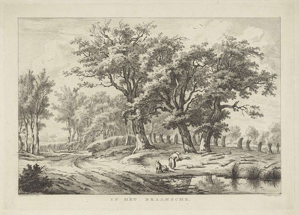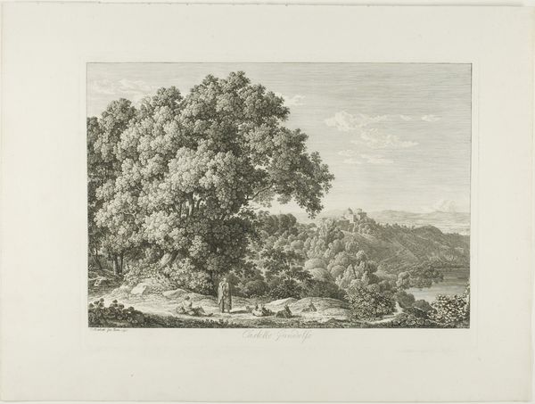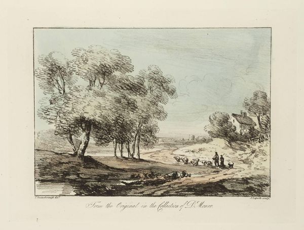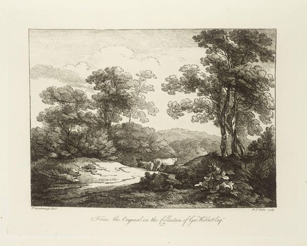 Curator: This landscape print is by Thomas Gainsborough, who was born in 1727 and died in 1788, and it's currently housed in the Tate collection. Editor: It possesses a certain tranquility, doesn't it? The etched lines create a soft, almost dreamlike quality, despite the stark monochrome. Curator: Gainsborough was deeply interested in the social impact of landscape. Notice how the scene invites contemplation, far removed from urban labor? Editor: Yes, and the composition is quite deliberate. The eye is led gently along the winding stream, a masterclass in perspective and tone. Curator: Absolutely. And consider the materials: etching allowed for wider distribution, bringing idealized nature to a broader audience. Editor: I see that. The texture of the trees feels almost sculptural, achieved through varying densities of line. I find that captivating. Curator: Knowing Gainsborough's social context, we can appreciate how this seemingly simple print speaks to a desire for escape and a critique of industrialization. Editor: A landscape imbued with so much history. It encourages a close observation of nature’s intrinsic beauty, and perhaps a touch of nostalgia too.