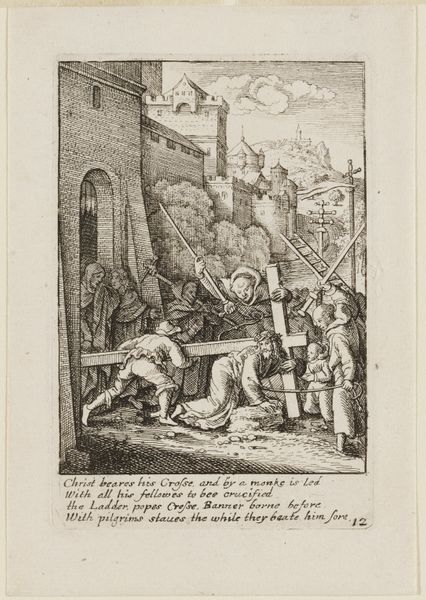 Thomas Wijck made this print, "Blind Beggar Bumping a Pillar," probably in the 1640s, using the etching technique. This involved drawing with a sharp needle through a wax coating on a metal plate, which was then submerged in acid. The acid would bite into the metal where the wax had been removed, creating lines that could then be inked and printed. The medium is crucial here. Printmaking was a way of disseminating images widely, creating a market for art that was more accessible than painting. Wijck and his contemporaries often turned their attention to everyday life. The image depicts a disabled beggar, caught in an undignified stumble, with other figures looking on. The work is filled with line work to convey the dilapidation of the architecture and the poverty of the figures. The very act of etching—a reproducible medium—mirrors the economic realities of the scene depicted, capturing a transient moment and making it available for consumption. It’s a fascinating intersection of materials, making, and social commentary.