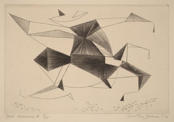 Curator: This etching by John Wells, appropriately titled "Abstraction," invites a close look at its intricate linework. Editor: It does, doesn't it? My first impression is one of organized chaos. The lines seem to dance, yet there's a clear structural foundation. Curator: Indeed. The artist’s decision to work within such a limited palette emphasizes the relationships between form and space, drawing the eye to the geometry at play. The balance of positive and negative space creates an almost architectural feel. Editor: And given it’s a work from 1950, one can’t help but wonder about the wider context of post-war abstraction and its drive towards rebuilding through new visual languages. Was this a conscious effort to break from figurative representation and embrace a more universal visual idiom? Curator: Quite possibly. The interplay of these lines serves as more than mere representation; it's a self-referential system, a play of forms creating an aesthetic dialogue. Editor: Perhaps. Thank you for pointing out these vital aspects of Wells’ work. Curator: A pleasure, the visual analysis truly enhanced my understanding.