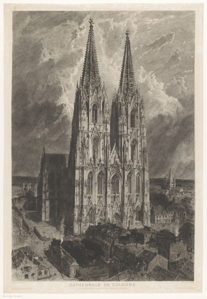 Curator: So here we have a photo reproduction of a print, probably dating from between 1855 and 1885, attributed to the Gebrüder Schönscheidt, depicting the Cologne Cathedral. What are your immediate thoughts on this cityscape, Editor? Editor: It feels like a dream… or perhaps more accurately, a half-remembered dream. Ghostly. The sepia tones lend an otherworldly feel, like looking back through time itself. The detail of the architecture is remarkable, it's overwhelming! It sucks you in! Curator: It really does. Notice how the photograph, acting as a reproduction, sort of layers time. The print itself likely interpreted the cathedral through an artistic lens, and then the photograph captures *that* interpretation. You're dealing with layers of cultural perception, a double remove. It has a quiet yet striking impact, right? Editor: Absolutely. Cathedrals, in general, function as incredible time capsules; buildings of community that were established at the very beginning of urban settlements. In terms of iconography, it towers both physically and spiritually, seeking connection between the terrestrial and divine. This pre-digital, handmade process enhances that feel. Curator: I wonder about the cultural weight that the Cologne Cathedral specifically held at this time. Construction originally began in 1248, was halted in the 15th century, and then restarted in the 1840s. It was intended as a grand statement of German identity and ambition. Editor: Exactly. By visually capturing such architectural detail and placing people at the base, there’s a way that you can comprehend that power—the weight of an idea taking physical form and becoming monumental—while retaining access through relatable, daily existence. Curator: And capturing this at a specific moment in time: the moment it comes into full realization. The architecture is Romanesque, drawing heavily on older artistic symbols to build modern cultural ideas. It's a truly stunning combination of elements. Editor: So true, It's hard not to get lost in the details of those soaring spires. Makes you consider all of our fleeting moments beneath such a solid entity. Curator: I'm definitely taking away a renewed appreciation for the dialogue between artistic representation, historical context, and the layers of time encoded within images. Editor: And for me, the importance of icons: solid architectural marvels can trigger an exploration of our collective past. Very humbling, isn't it?