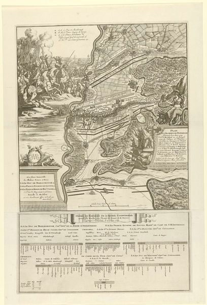 Curator: This engraving from 1704, titled "Kaart van het gevecht bij Donauwörth, 1704," details the Battle of Donauwörth. The print, created through engraving, provides a fascinating glimpse into the strategies and perspectives surrounding this historical event. Editor: It strikes me immediately how precise the linework is; it almost seems sterile. And yet, those meticulous details—the rendering of fortifications, for instance—give the overall composition a certain intensity. Curator: Absolutely. Consider the social and political implications embedded in this seemingly objective depiction of war. Who commissioned it? Whose perspective does it champion? Understanding its function as propaganda or a historical record is crucial. This occurred during the War of the Spanish Succession, a major turning point in European power dynamics, which also raises issues of colonialism. Editor: From a formal perspective, the use of shading to suggest topography is remarkably sophisticated. Notice how the dense cross-hatching delineates the fortified positions, creating depth and texture. Semiotics helps in unraveling these symbolic aspects of lines and patterns that are representing real geographical locations. Curator: Exactly. It offers insights into baroque approaches to representing power through territory. Moreover, analyzing the linguistic component, with its descriptions of troop movements, adds layers to our interpretation, touching on class and societal control. Editor: It all funnels down to visual problem-solving in this artistic approach, don't you agree? This approach to layout and the balanced deployment of descriptive elements reveal how strategic information could be turned into accessible visuals, if not engaging entertainment for period viewers. Curator: It's precisely these competing discourses—propaganda, documentation, artistic merit—that render this map so intriguing, allowing us to challenge accepted historical narratives and discuss how visual representations influenced public opinion and solidified power structures of that period. Editor: Indeed, and now seeing it as a whole, one really is just impressed by the artist’s technical acumen, even in this humble format.