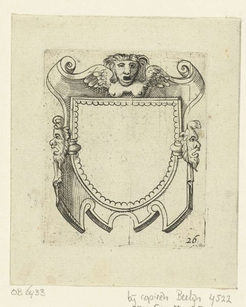 Curator: This is "Cartouche in de vorm van een schild", a metal engraving by Lodovico Mattioli, created sometime between 1670 and 1680. Editor: What a fascinating find! It feels immediately grand, even imposing. The symmetry, the crown… there's an aura of power, though it's somewhat undermined by the emptiness of the shield at the center. Curator: Absolutely. Let's consider the method: the etching itself is meticulously executed, indicative of skilled labor and an engraver deeply versed in ornamentation. Each flourish must have demanded countless hours, revealing a network of workshops churning out such images during this period. This isn't just 'art'; it's a testament to the crafts and the economies that flourished during the baroque era. Editor: For me, it's all about the visual language it employs. Look at that cartouche, the cherubic figure above it… there's such a clear message about authority and heritage being conveyed. It makes you wonder about the psychological impact of displaying these symbols so openly. Were these symbols aimed at reassurance, or were they intimidating to certain members of society? Curator: It's compelling how this piece allows us to delve into those issues. While your focus is on the grand narrative conveyed by symbols, I am looking at the social narrative behind its crafting. The level of detail suggests it wasn't just a simple production but was born from a well-oiled production system – maybe it was an artisan benefiting from court patronage, given the opulent style? Editor: It almost serves as a snapshot of values – Baroque splendor colliding with that need to showcase power and belonging. Think about the tradition of coats of arms! It really drives home how visual communication has always helped mold group and self-identity. Curator: And by examining Mattioli's labor in its material existence – the tooling marks, paper quality and ink formulas – it also encourages dialogue around the social status and potential political associations linked to engraving such imagery back then. Editor: True! Together, the combination makes one potent image. It shows an interesting crossroads of craft, artistry, and socio-psychological symbols all within this single "Cartouche." Curator: Indeed. We often separate "art" from its process, yet through exploring the means of creation, these ornamental images open exciting doors into otherwise forgotten historical circumstances.