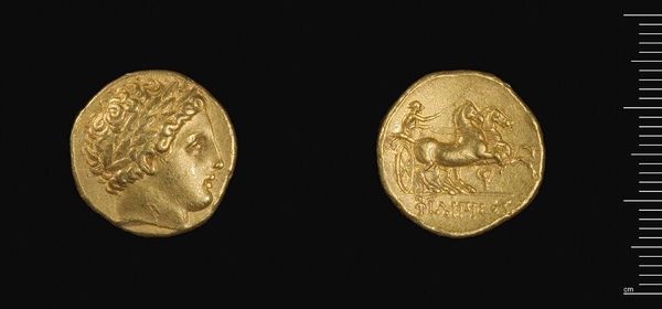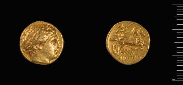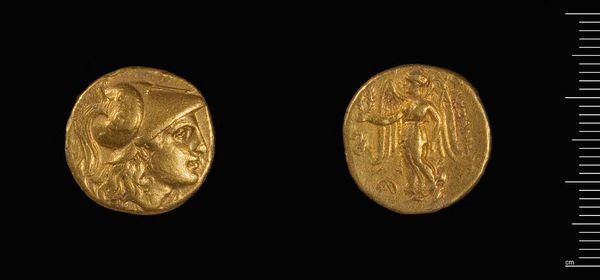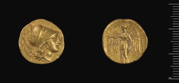 Editor: Here we have a Stater of Alexander the Great, dating from his time in Babylon, on view here at the Harvard Art Museums. Curator: It's a small thing, isn't it? I can almost feel the weight of empires resting on those few grams of gold. It's lovely, the colour of old sunlight. Editor: The minting of coins like this played a vital role. Gold, sourced and processed through arduous labor, became a tool for funding Alexander's military campaigns. Curator: Yes, but it's more than money, right? This coin is like a little myth in metal. The winged figure, perhaps Nike, feels almost...tender. Editor: Tender, and yet rigorously standardized. Each coin a product of precisely calibrated dies and a testament to centralized control. Curator: Maybe, but I prefer to imagine the hands that held it, the hopes and dreams it represented, the stories it could tell. Editor: Indeed. It's a potent reminder of how deeply intertwined economics, politics, and art were in the ancient world.