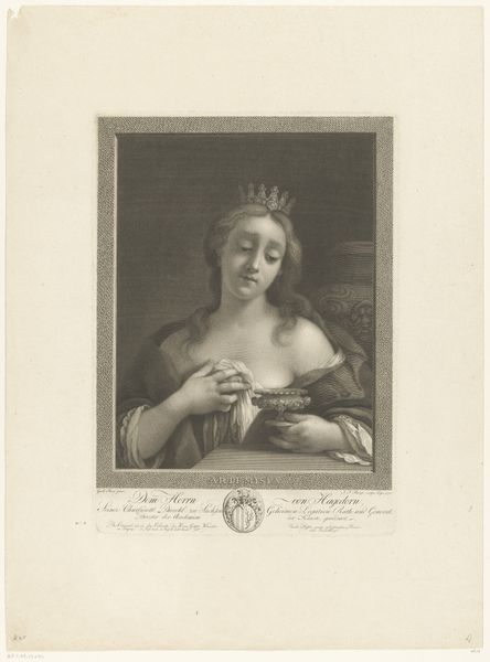 Editor: Here we have Johann Heinrich Lips' "Artemisia met de as van haar man Mausolus in een beker," created in 1781. It's an engraving, and the queen's somber expression gives the piece a heavy, almost mournful feeling. How do you interpret this work? Curator: The means of production are central to this image. Lips uses engraving, a readily reproducible medium, to disseminate a particular image of power and grief. It links artistic creation directly to the broader sphere of consumption and circulation of ideas about status, loss, and mourning. The printing press democratized imagery, making what was once confined to painted portraits accessible. Editor: So the print medium itself changes the meaning? It's not just about portraying Artemisia? Curator: Exactly! We must consider how Lips, through the very act of making an easily reproducible print, reshapes and disseminates the story of Artemisia. Think about who the likely consumers of these prints would have been: aspiring members of the merchant class who sought visual culture in a way never before seen. This work embodies grief but more accurately signals something about burgeoning social status achieved via consumer access to imagery. The materiality and reproducibility challenges traditional aristocratic forms of mourning and memorializing grief through painting or sculpture that would exist singularly for the elites.. Editor: That’s a fascinating perspective. It’s easy to get caught up in the subject and forget about the materials and how they affect the work's impact. Curator: Indeed. And by doing so, we ignore art as a commodity that reflected cultural shifts beyond mere artistic or creative expression. Consider, too, the paper, ink, the very labor required. It asks how notions of mourning are produced, commodified, and circulated, reaching further than traditional venues of consumption or viewership. Editor: I never thought of engravings having such a socioeconomic story behind them. I will look at prints a bit differently now. Thanks! Curator: Absolutely! Examining the artmaking process illuminates so much more than intention. It's about cultural fingerprints.