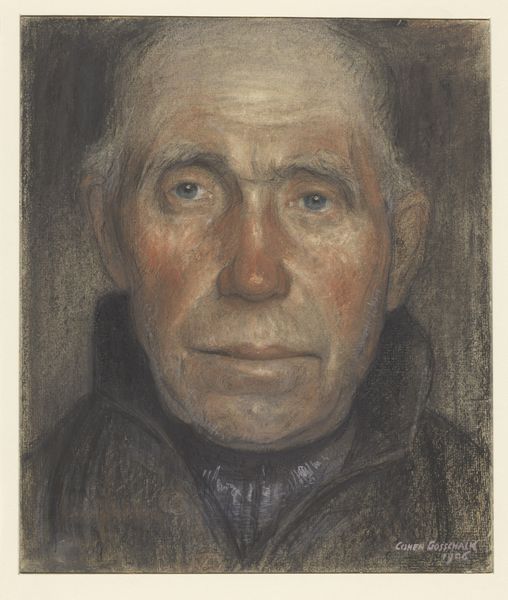 Curator: Let’s discuss Karl Schou's "Self-Portrait" from 1936. The painting is held at the SMK, the National Gallery of Denmark, rendered in oil paint. Editor: The first thing that strikes me is the somber tonality. There’s a definite austerity in the colour palette; grey, blues and dull white. It gives the portrait an almost melancholic atmosphere. Curator: Agreed, but let’s consider the materiality itself. The brushstrokes, visible and direct, reveal Schou’s engagement with the act of painting. He captures his likeness, yes, but it's also a record of a specific process in 1936—a time of considerable social and economic unease in Europe. Was he reflecting this through the direct application and somewhat bleak tonality of the piece? Editor: Possibly, but focusing solely on socio-economic conditions might limit our understanding. Look at the way light falls across his face, the sharp contrast emphasizing his bone structure and drawing attention to his gaze. The asymmetry in his eyes—it conveys so much! Curator: Right. But the sitter, positioned centrally, wearing a rather formal shirt, waistcoat and tie. It reflects middle-class values, perhaps Schou's self-positioning within the professional structure of artistic labour, rather than seeing himself as a bohemic counter-culture. The portrait becomes evidence of material identity. Editor: Perhaps, and his artistic choices contribute significantly to its mood and effect. The layering of colours to convey age, for example. Notice how the paint isn't blended smoothly; he used discrete strokes, suggesting the passage of time. This, combined with the subtle expression, grants the work its distinctive character. Curator: So in a formal sense, the slightly muted aesthetic has ties to the austerity of its time? Editor: In a way, yes. By dissecting these pictorial choices we're not just seeing a likeness; we're interpreting how colour, light, and composition work together. Curator: I appreciate how this exploration clarifies Schou's negotiation of the artistic and economic conditions of his time, bringing to the surface some thought-provoking intersections of making and being. Editor: Exactly, it highlights how artful elements contribute to creating not just an image, but an impactful reflection of being human.