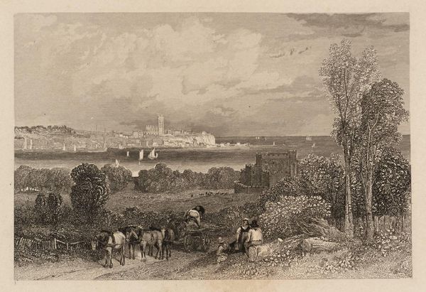 Curator: This is "A View of Oxford from the Abingdon Road" by John Pye the Younger, housed here at the Harvard Art Museums. It presents Oxford as seen from a distance. Editor: It feels dreamlike, almost faded. Like a memory gently blurring at the edges. I wonder, was the artist feeling nostalgic? Curator: Perhaps! The Abingdon Road was a key route into Oxford, and images like this reinforced Oxford's image as a center of learning and a picturesque landscape, particularly in light of industrialization. Editor: I love how the details soften as you go further into the image. It makes the city seem almost ethereal, like a floating vision on the horizon. Curator: Indeed, these depictions helped shape perceptions of Oxford. Editor: It's more than just a pretty picture; it's about controlling a story. I like that insight. Curator: Exactly. It shows how even landscapes participate in broader narratives.
