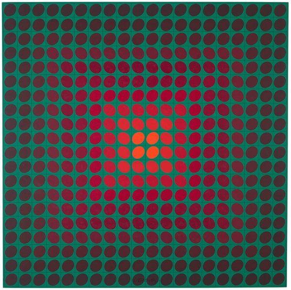 Edna Andrade created "Red Flash," an eye-popping print composed of vibrant colors and simple shapes. Likely a silkscreen, the image consists of rows of circles, each divided into two halves of either red or turquoise, set against a flat blue ground. The effect is mesmerizing. The material qualities of ink on paper are used here to create an experience of pure visual sensation. The sharp edges and flat colors speak to the industrial processes that enabled Andrade to create the print. Her work reflects a mid-century fascination with mass production, and the blurring of lines between art, design, and craft. Andrade embraced these printing techniques, challenging notions of the artist as a solitary creator, and elevating these methods to high art. By focusing on materials and processes, we can appreciate how Andrade transformed ordinary materials into something extraordinary.
