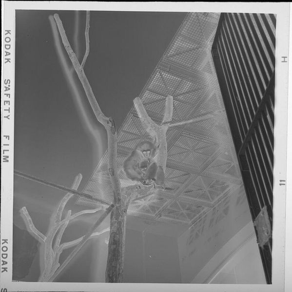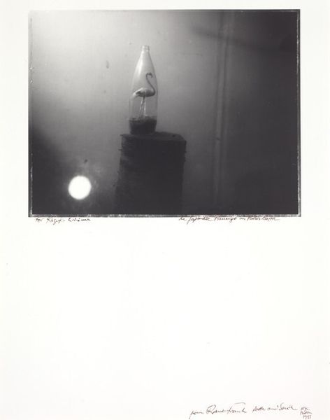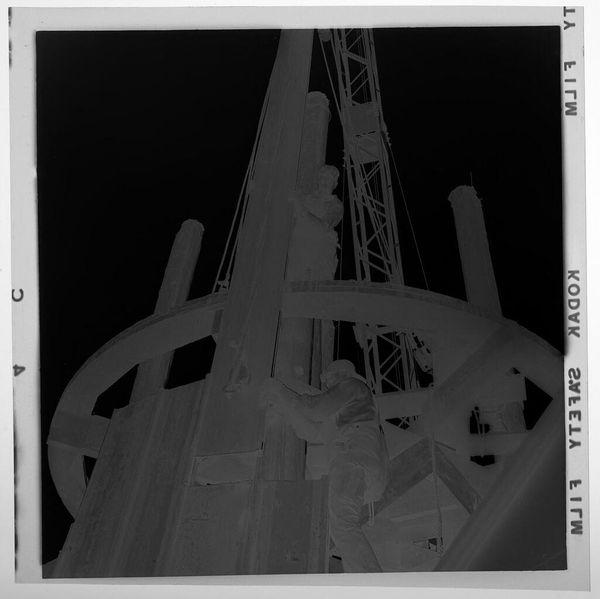 Editor: This small, undated photograph by Jack Gould, titled *Untitled (Men working on large machinery, seen from below)*, presents an inverted view of laborers against a stark sky. What narratives do you see emerging from this snapshot of industry? Curator: It highlights the often-unseen labor underpinning societal structures. How does the inverted perspective influence our perception of these workers and their relationship to the towering machinery? Editor: It definitely makes me consider their vulnerability, especially with the negative image. Curator: Precisely. And considering the lack of information surrounding this piece, it challenges us to contemplate the socio-economic contexts inherent in labor and representation. What did you take away from this piece? Editor: I now recognize the importance of acknowledging those who build our world, even if they are invisible to us.