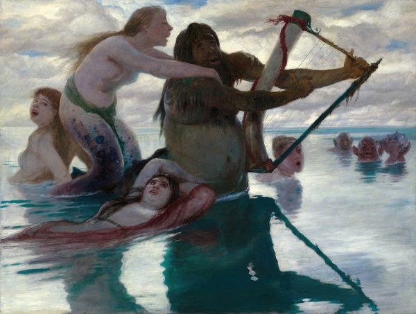 Curator: This is Ferdinand Leeke's 1913 oil painting, "The Rhinemaidens." It presents a dramatic scene pulled straight from Wagnerian opera. What is your first impression? Editor: Well, my initial response is one of unease. The reddish sky and churning water create a sense of impending doom. There is also a very pronounced depiction of pale bodies and red hair against dark colors that does not invite gentle gazes, to say the least. Curator: I agree the painting strikes a discordant chord. Leeke uses a heightened sense of color and brushwork to visually manifest a kind of sensory and emotional overload through purely aesthetic elements. Look at the contorted bodies and how their musculature is rendered. Editor: It's hard to ignore the inherent gender dynamics at play here. These nude female figures seem positioned entirely in relation to the armored male figure, burdened by his weight in water. This reminds me of similar paintings, for example, Bouguereau, who displays very disturbing dynamics in which idealized female figures become central to historical narratives. Curator: Certainly, that tension exists within the visual space of the artwork. The figures, while idealized, are rendered with a clear understanding of anatomy. Observe the use of light, how it sculpts form and pulls the viewer's eye across the composition, beginning perhaps with that bright star that serves as a sort of structural anchor, even. Editor: Absolutely, although I think it's crucial to remember how Wagner’s work, and by extension artworks such as this, were embraced during periods of intense nationalism. The almost propagandistic role these paintings could play demands consideration, especially concerning their presentation of idealised, hypersexualized feminine figures. It feels imperative to interrogate what purpose such depictions served and continue to serve in shaping our understanding of mythology and the roles of women. Curator: Your point is crucial in considering not just its beauty but its impact as a cultural artifact. It compels me to think more about how beauty is wielded to serve specific ideological and structural goals. Editor: Right. Thinking of "The Rhinemaidens" through that framework, beyond its face value, deepens the discourse significantly, creating richer insights on power.