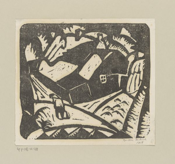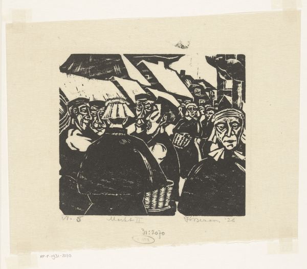 Editor: So, this woodcut is called *Woonwagens*, made in 1924 by Jo Bezaan. It’s currently housed at the Rijksmuseum. I'm struck by the intensity of the black and white – it gives the whole scene a real dramatic feel. What catches your eye when you look at this, what’s your interpretation? Curator: Well, first, doesn't that title just roll off the tongue with a sense of home, of rootedness... and yet the image itself hints at a life always on the move? Notice the dense thicket of trees that confine our gaze. What kind of emotional impact do you think that's having on us as viewers? Editor: I see what you mean! The title implies a kind of rustic domesticity, but those sharp, angular shapes, and the way the light and shadow fight...it feels almost unsettling, not peaceful at all. Curator: Precisely! There is definitely a push and pull between the idyll of the title, the reality of the sharp expressionist forms, and what may actually be the experience of nomadic people at that time. How might we interpret their place and that of the domestic horses in this somewhat contained wooded scene, for instance? Editor: It almost feels as if the landscape is encroaching upon the figures. A reflection perhaps on the vulnerability of transient life? I hadn’t thought of it that way. Curator: It is quite remarkable! It goes to show how a deceptively simple print can open a whole can of questions. An amazing work, wouldn't you agree? Editor: Absolutely, I love that so much is conveyed with just black and white and a small woodcut. It really adds so much more to the historical record of life at the time!