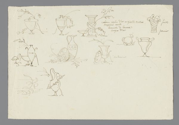 Curator: Here we have a lithograph, brimming with visual wit, created by George Augustus Sala in 1850. The title, quite a mouthful, is "The Great Exhibition 'Wot is to Be', Probable Results of The Industry of All Nations in The Year '51, Showing What is to be Exhibited, Who is To Exhibit, in Short How Its All Going to Be Done." It resides here at The Met. Editor: My initial impression is that it looks like a collection of cleverly rendered absurdities. There’s a light, satirical quality, despite the somewhat detailed drawing style. The figures and contraptions are simultaneously funny and strangely disturbing. Curator: Indeed. Sala uses caricature to critique and forecast the impact of the Great Exhibition, focusing on industrial progress. Note the rigid lines, precise detail rendered via crosshatching: He mimics technical drawings to subvert them. Each "invention" is meticulously illustrated yet utterly preposterous. Editor: Precisely! Look at this…‘Patent sheep Tailoring Machine.’ It epitomizes the fear of automation, rendered as something almost medieval. The symbol of the woman entering and the rich Sour Teilor coming out embodies a deeper class struggle, of craftsmanship devalued by industrial efficiency, or in other terms a societal transfiguration by industrial development. Curator: And what about the so-called 'Genius of Hardware'? The symbolism feels quite potent here, doesn’t it? It’s like a deity presiding over industrial manufacture, wielding sharp points with threatening undertones. Editor: Exactly! We see industrial expansion as the New Divinity here! But if you carefully view "The Procession of Brummagere Buttons," it's clearly a statement on standardization and dehumanization, the tiny workers and their monotonous labour. It's quite the sharp critique masked in humor, very much of its era and, I think, enduringly relevant today. Curator: I concur, its resonance comes from the inherent anxiety linked to technological advancement. Editor: The artist successfully interweaves fear and humor, highlighting both the promise and peril of the age. I am grateful to see what history could not anticipate from technology at that moment. Curator: A complex reflection presented as a series of deceptively simple vignettes. This shows us an artist very keyed into social conditions of their day.