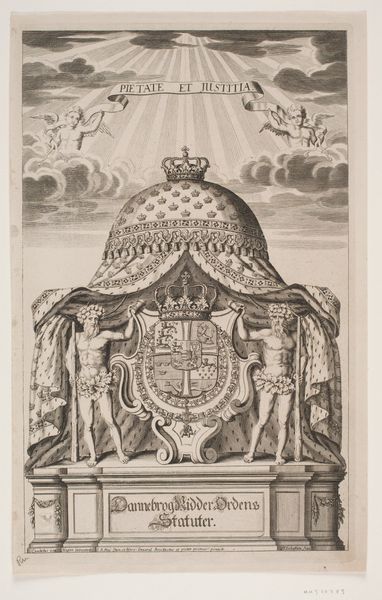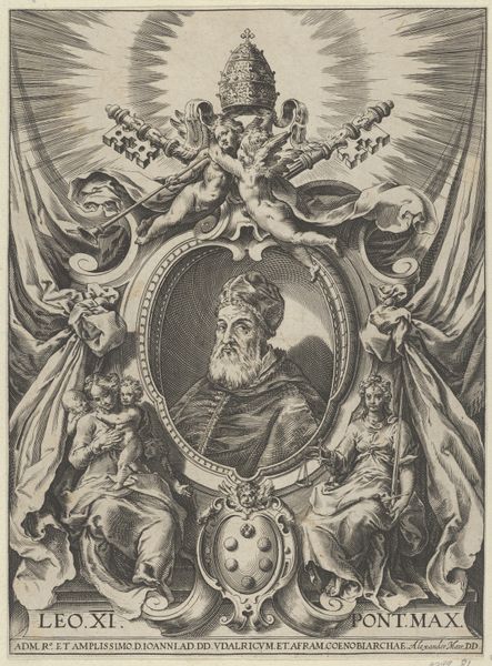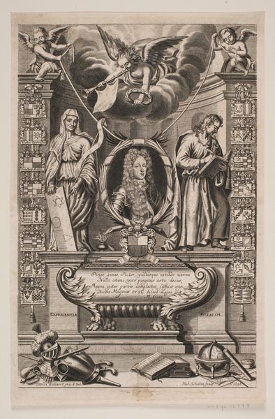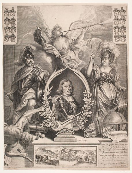 Ludovicus Salm created this print of Vincent Joachim Hahn sometime in the 17th century, with etching. This print exemplifies the baroque period’s flair for the theatrical. The detailed allegorical presentation of Hahn, framed by classical columns, creates a sense of grandeur. The many coats of arms surrounding Hahn, the figure blowing a horn above him, and the Latin inscription at the base all speak to the importance of lineage and legacy in 17th-century European society. Made during a time of significant social stratification, this print served as a powerful visual representation of Hahn's status. It was a period when the aristocracy used art to affirm their power. It would be worth researching the history of the Hahn family, scrutinizing genealogical records and other related prints to understand better how the cultural values of this period shaped artistic output. The meaning of art is always contingent on social context.