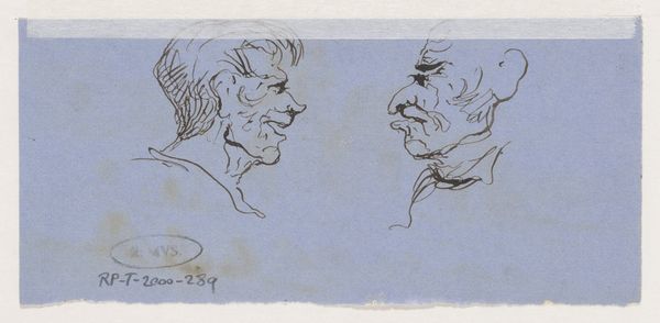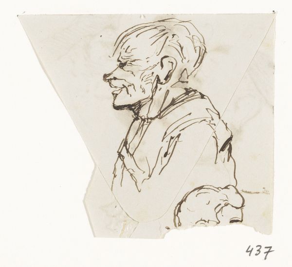 Editor: This is “Kop,” a drawing by Johannes Tavenraat, sometime between 1840 and 1880. It’s rendered in ink on paper. I'm immediately struck by how expressive the face is, even though it's just a sketch. What do you see in this piece? Curator: I see the weight of experience etched onto this man’s face. The artist captures the passage of time, not just in wrinkles, but in the very slump of the head and the deep-set eyes. Notice how the shading emphasizes certain features – the nose, the brow – creating almost mask-like forms. These resonate with the symbolism we often see in ethnographic studies. This echoes familiar characters or societal archetypes within its community, wouldn't you agree? Editor: That's a really interesting take. I was thinking more about individual expression, but I see what you mean about the archetype. The face almost seems like a caricature, exaggerating certain features. Curator: Exaggeration, yes, but also a kind of shorthand. Consider how the artist uses just a few lines to suggest the folds of the neck or the shape of the ear. These details speak to collective cultural memory of aging and perhaps wisdom - traits the community has valued throughout its history. Editor: So, it's not just about this one person, but about larger cultural ideas? Curator: Precisely. It’s a visual condensation of societal understanding, transformed and immortalized within the sketch's iconography. Editor: That's fascinating. I initially saw a simple portrait sketch, but now I see how it speaks to broader cultural themes. Thank you! Curator: Indeed. The power of images lies in their ability to hold multiple layers of meaning across generations. A seemingly simple sketch unveils narratives etched deeply within a community’s heart.