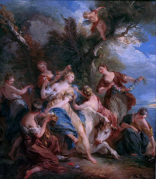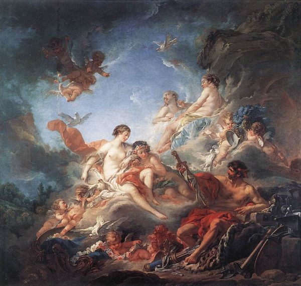 Editor: "The Rising of the Sun," painted in 1753 by Francois Boucher, is breathtaking in its scale and color. It really is a swirl of bodies and clouds. How would you interpret this work within its historical context? Curator: Boucher's "The Rising of the Sun" encapsulates the Rococo spirit, commissioned during a period of immense political and social tension, yet dedicated to fantasy and decoration. Consider its original setting, most likely a palace, as pure theatre for the elite. How does this image function to legitimise royal power through allegory? Editor: It's interesting to think of it as propaganda almost, despite the fluffy putti! So, you are suggesting the mythological theme served a very practical purpose? Curator: Precisely. Mythological paintings like this weren't simply decorative; they promoted a specific view of power and order. Take, for example, how light triumphs over dark. In what ways is this linked to the patron, or audience, of this piece? What ideals might they seek reflected in its visual symbolism? Editor: That's a great way to put it into perspective. It is fascinating to realize art always has a job to do, and it isn't always pretty! Curator: Absolutely! Analyzing these works allows us to grasp not only aesthetic shifts, but also the ideologies woven into the very fabric of their creation, and consumption. What was made visible, and who benefited from the telling of certain tales, over others? Editor: I never thought of looking at the story of the piece through the lenses of political advantage, power and ideology. Thanks!