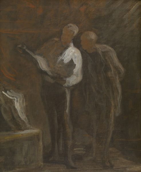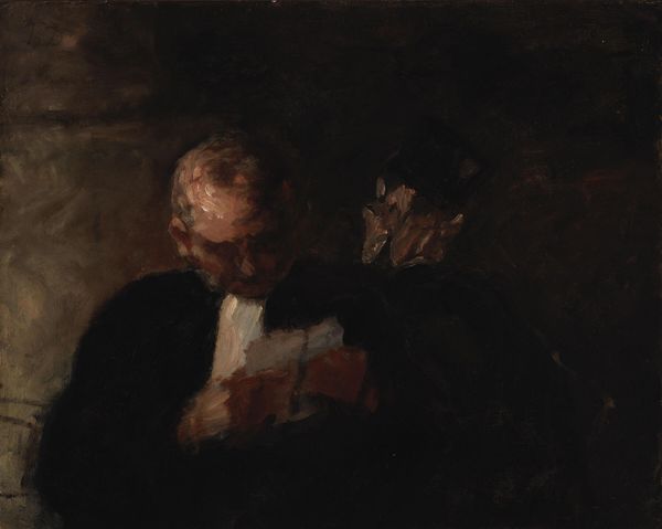 Honoré Daumier painted "The Reading" with oil on canvas, a traditional choice, yet he used it to capture the spirit of everyday life. The rough texture of the brushstrokes gives a sense of the immediacy of the scene, two men sharing a moment over a book. The darkness of the pigment is heavy, not jewel-like, but dense and earthy. The painting looks as if it were made quickly, with a gestural approach that values capturing the moment over laborious refinement. Daumier's background as a printmaker, creating images for mass consumption, is relevant. His focus was always on the lives of ordinary people, not the rich and powerful. There is a kind of labor embedded in the scene itself; reading as a form of self-improvement, of solidarity. The heavy darkness from which the figures emerge hints at the wider social struggles of the time. Daumier elevates the everyday through attention to the ordinary, creating a vital and enduring image.
