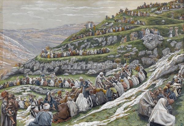 Curator: Well, hello there. What strikes you first about this image? Editor: Dust. And apprehension. I mean, look at the slumped figures in the foreground; you can almost feel their weariness, the grit between their teeth. But then, looming in the background is that army – is that an army? Curator: It is indeed! This watercolor by James Tissot, completed in 1902, depicts the moment Jacob sees his brother Esau approaching with armed men. The piece is titled 'Jacob Sees Esau Coming to Meet Him'. Tissot’s later career was marked by his illustrations of Biblical scenes, wasn't it? He aimed for historical accuracy, informing his art by traveling to the Middle East to research customs, dress and landscapes. Editor: That explains the… muted palette? It’s less "religious art" and more…reportage, almost. And those huddled figures definitely bring it into our emotional present. Curator: Tissot was working at a time when increased archeological exploration and the rise of anthropology created a demand for such portrayals. They promised viewers authenticity – albeit seen through a Western European lens. Editor: The detail is impressive for watercolor – almost photographic in that vast procession. Yet the soft hues create an otherworldly haze; a perfect emotional counterpoint for the heavy anxiety etched on the figures we see. It asks a lot of the viewer doesn't it? To reconcile all of that in a single moment. Curator: It invites us to reflect on the power dynamics and cultural assumptions inherent in representing historical events. Look at who is granted prominence and whose perspective dominates the narrative, for example. Editor: You know, I came here expecting stained-glass romanticism, and instead I’m face-to-face with a scene pregnant with very modern ambiguities. Thank you, James. Curator: A fitting reminder that seeing, truly seeing, is always an act of interpretation, isn’t it?