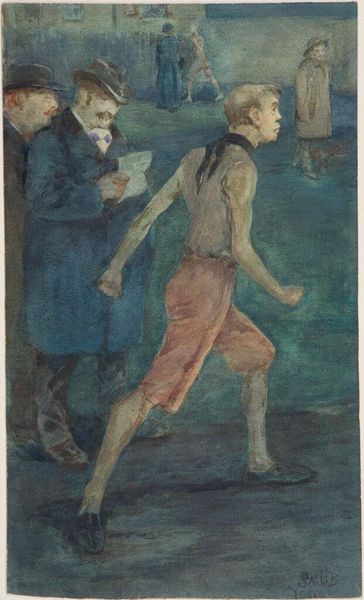 Ferdinand Hodler created "Running Women" with oil on canvas to evoke the feeling of movement through a series of female figures. Each is caught in a moment of forward momentum. Hodler masterfully uses a limited palette and repetitive forms to suggest rhythm and progression. Observe how the ochre and earthy tones of the dresses blend, creating a sense of unity. Hodler uses 'parallelism' to create a sense of order. The linear arrangement emphasizes a shared direction and synchronized movement. Hodler here is working towards a theory of art that he called 'Parallelism', which stipulated that people, emotions and forms repeat themselves in life and art. The women themselves are largely indistinguishable, contributing to a collective rather than individual experience. Hodler's treatment of space is also notable. The background is vague. This ambiguity focuses attention on the figures, which seems to suggest the universality of motion and collective human action. The formal qualities of repetition and rhythmic composition invite contemplation on the structure of movement.