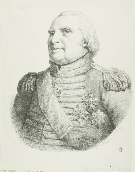This portrait of Louis XVIII of France was made by Zéphirin Belliard using the technique of lithography. Unlike painting or sculpture, lithography is a printmaking process, which relies on the skilled labour of the artist to transfer an image onto a stone or metal plate. The image would be drawn onto the surface with a greasy crayon or ink. Then, the plate is treated so that ink only adheres to the drawn areas. The printmaker can then produce multiple impressions of the original image. Lithography allowed for a democratization of portraiture, making images of the elite more accessible to a wider audience. The texture and tonality seen here are a direct result of the lithographic process. The subtle gradations of light and shadow suggest the artist's mastery of the medium, coaxing a range of effects from a relatively simple process. This portrait thus speaks to both the power of the monarchy and the rise of industrial modes of production, blurring the lines between fine art and reproductive craft.